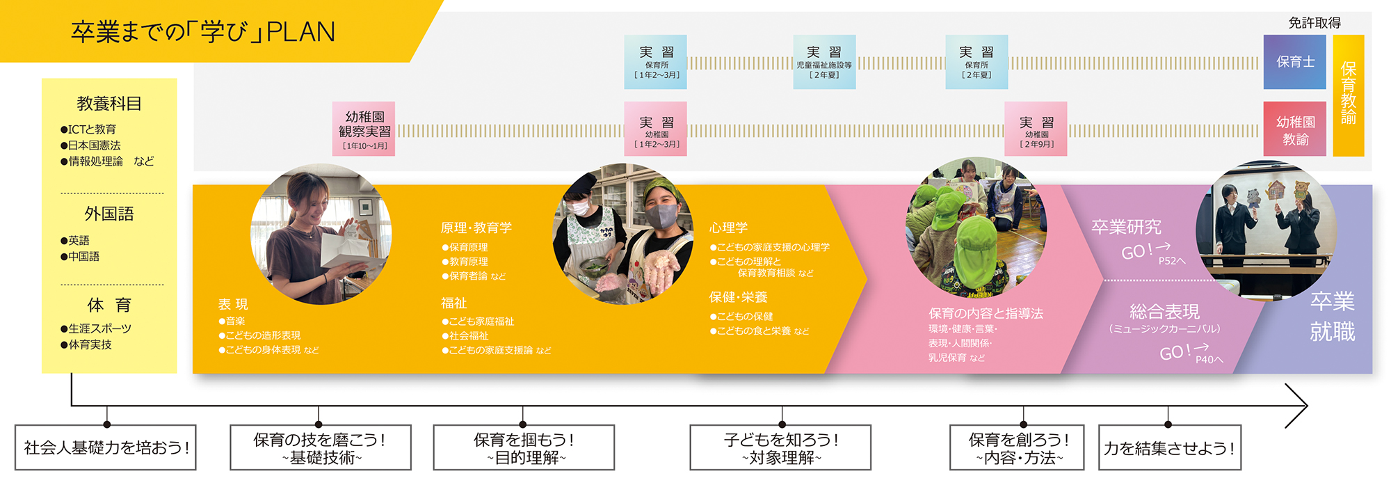 保育者として必要な実践的知識と技術の修得・向上はもちろん、社会人として必要な教養や感性を磨き、豊かな心でこどもや保護者を支援できる“保育のスペシャリスト”を養成します。