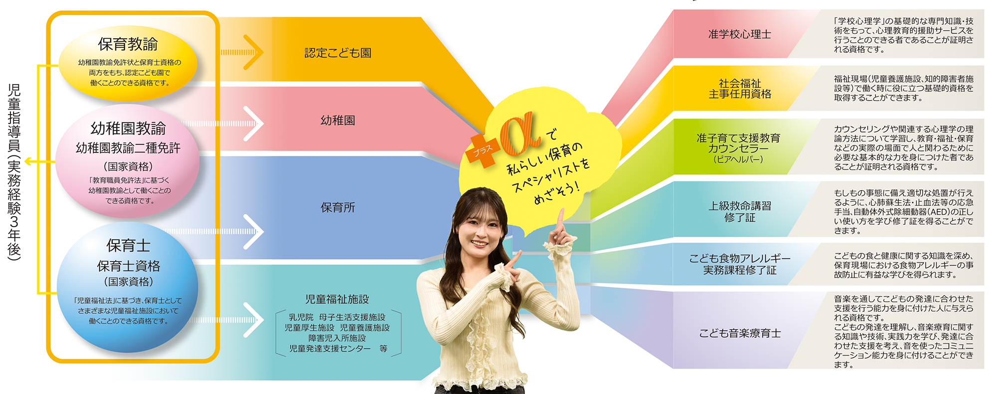 わずか2年間で、幼稚園教諭二種免許と保育士資格の2つの国家資格が同時に取得できるよ。また、2年間の授業料で、3年制、4年制での2資格取得もめざせるよ。学びのペースを自分にあわせられることも魅力的だね。児童福祉施設で「保育士」として、幼稚園で「幼稚園教諭」として、さらには、認定こども園で「保育教諭」として働けるよ!